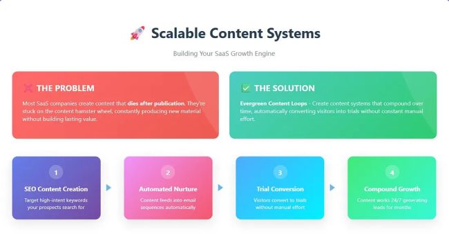 6 Proven SaaS Growth Strategies for Exponential Scaling 1. Scalable Content Systems: Building Your SaaS Growth Engine The Problem: Most SaaS companies create content that dies after publication. They’re stuck on the content hamster wheel, constantly producing new material without building lasting value.