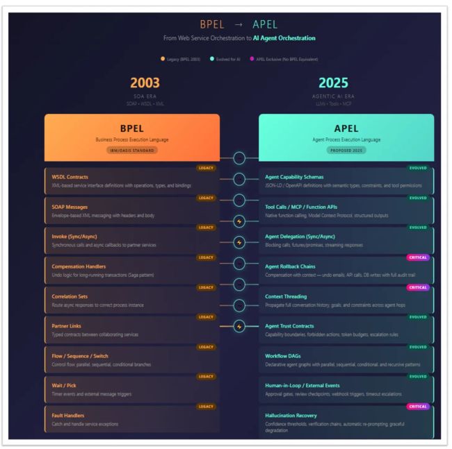 - On top of that, we need APEL, an Agent Process Execution Language: a modern BPEL-for-agents that brings compensation, typed contracts, correlation, checkpoints, and observability to multi-agent workflows.