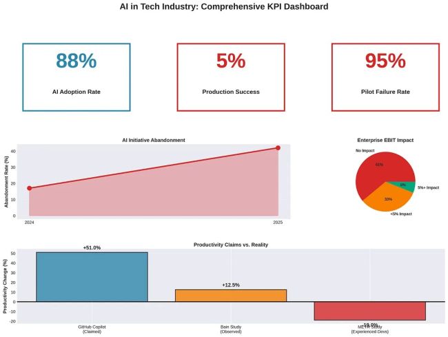 Our analysis reveals a significant and widening discrepancy between the hype surrounding AI and the reality of its implementation and impact. While AI adoption is widespread, its return of investment is still to be met across various big companies that praised its revolutionary impact in the automation of processes. The data overwhelmingly demonstrates that AI technologies, particularly prompt engineering and AI coding agents, have not lived up to their promises for most companies.
