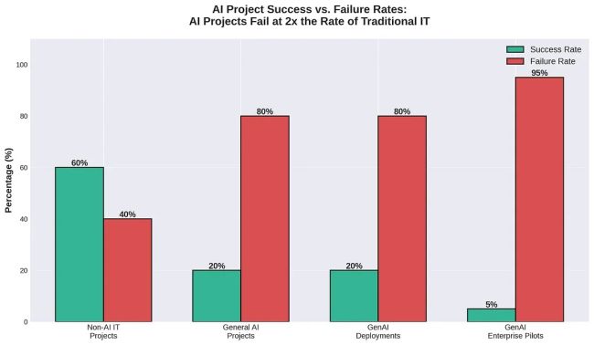 This chasm is further evidenced by catastrophic project failure rates. A 2025 MIT report found that 95% of generative AI pilots fail to deliver a return on investment [1]. This is more than double the failure rate of traditional, non-AI IT projects, which stands at around 40% [6]. The situation is so dire that 42% of companies abandoned most of their AI initiatives in 2025, a 148% increase from the previous year [7].