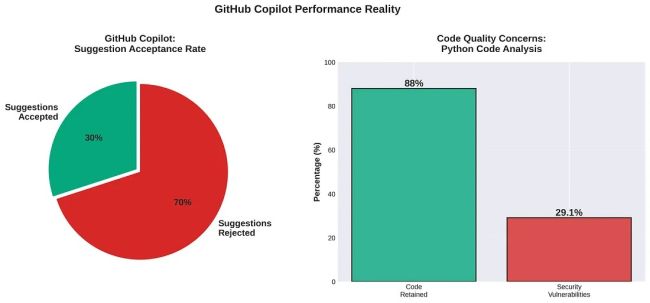GitHub Copilot, the market leader with over 15 million users, claims to make developers up to 51% faster [8]. While our research confirms high engagement, with 67% of developers using it at least five days a week, the actual effectiveness is questionable. The average acceptance rate for Copilot's suggestions is only 30%, meaning developers reject 70% of what the AI generates [8]. More alarmingly, a significant portion of the accepted code may be flawed, with 29.1% of Python code generated by Copilot containing potential security vulnerabilities [8].