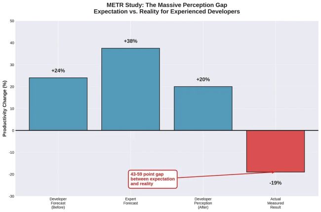 The most definitive evidence comes from a rigorous Randomized Controlled Trial (RCT) conducted by METR in 2025. The study, which focused on experienced open-source developers, produced a shocking result: AI tools made these developers 19% slower [3]. This stands in stark contrast to both expert forecasts and the developers' own self-reported perceptions. Even after being slowed down by the AI, developers believed the tools had made them 20% faster, highlighting a massive perception gap.