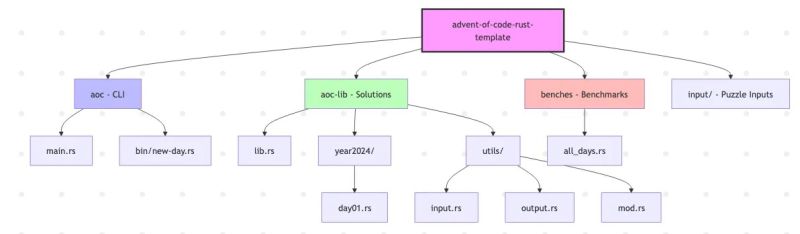 Finally, the template avoids unnecessary abstractions. Advent of Code puzzles don’t follow a predictable structure, so traits, macros, or generic parsing layers often create more work than they solve. A straightforward, explicit project layout ends up being the most flexible approach.