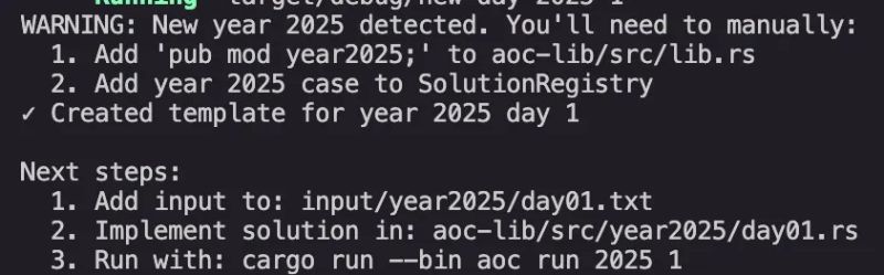 Work on the next day ( 2, 3, 4 …) First generate the new day’s module, file, and input directory. Example for day 2 below: cargo run - bin new-day 2025 2 // change the day value as needed Repeat steps 1, 2 and 3 from above, changing the day value to match as needed. Once you understand this workflow, the remaining features fit naturally.
