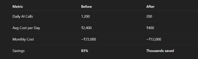 The Results: 83% API Reduction Overnight MetricBeforeAfterDaily AI Calls1,200200Avg Cost per Day₹2,400₹400Monthly Cost~₹72,000~₹12,000Savings83%Thousands saved Imagine saving this much without downgrading model quality.