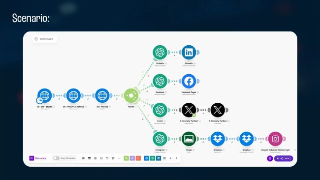 Now we have the details and images of the best-selling Amazon products, and it’s time to create tailored content to share on your social media. Here, we have four modules of OpenAI dedicated to creating content for LinkedIn, Facebook, X, and Instagram. Each module will generate tailored content for each social media platform to engage your audience and persuade them to purchase your product.
