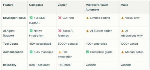 How Composio Stacks Against the Competition The AI integration landscape is crowded, but Composio differentiates itself through developer-first design and production-ready reliability. Here’s how it compares to major alternatives: