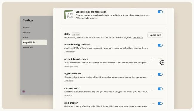 When you request something like “create a sales presentation following our brand guidelines,” Claude recognizes two relevant skills: presentation creation and your brand standards. It loads both, coordinates their use, and gets to work.