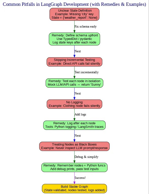 New developers don’t log their state transitions, so they do not see where the state is failing. Example: your weather node used to output correctly, but your clothing node is failing silently (you can’t see the cause). Fix: You can use print() function or logging from Python to see state evolution. Always log afterwards each node.