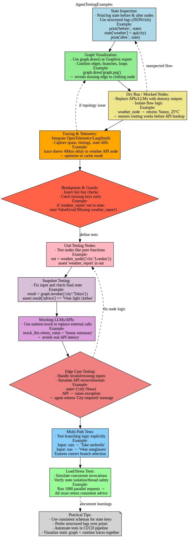 This way, if something goes wrong later on, it won’t be silent. Testing Agent Behaviors Unit Testing Nodes: Each node is basically a Python function → just test them as you normally would: