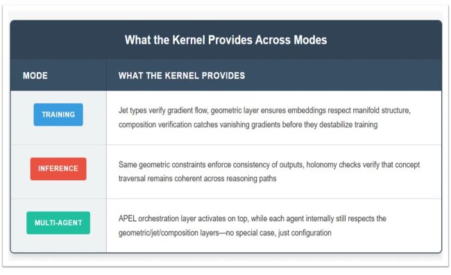 The slogan: Linear algebra is correct locally. But theAI kernel should enforce correctness globally. As you can see in Figure 1 above. Current frameworks do linear algebra at each step and hope global structure takes care of itself. It doesn’t. That’s where hallucination and concept drift emerge: local computations are fine, but nobody tracks what happens when you compose them across the manifold.