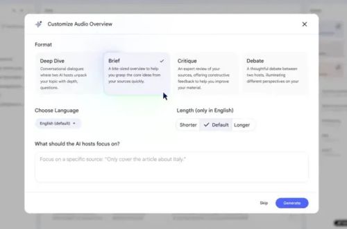 Google’s AI-driven research and note-taking tool, NotebookLM, has introduced new customization options for its Audio Overviews, which are AI-generated podcasts featuring virtual hosts that summarize and discuss user-uploaded documents, such as academic readings, legal briefs, or research papers. These enhancements allow users to tailor the tone and style of the podcasts to better suit their needs. When creating an Audio Overview, users can now choose from four distinct formats: “Deep Dive,” “Brief,” “Critique,” or “Debate.” The Deep Dive format features two AI hosts engaging in an in-depth, conversational exploration of the topic, asking questions and unpacking details with nuance. The Brief format is designed for quick comprehension, condensing the core ideas from uploaded sources into a short, digestible summary. The Critique format offers a detailed review of the documents, providing constructive feedback to help users refine their work. Meanwhile, the Debate format pits two AI hosts against each other, presenting contrasting perspectives on the source material to highlight different angles. Users can further customize the duration of each podcast, choosing whether they want a shorter or longer version based on their preferences.