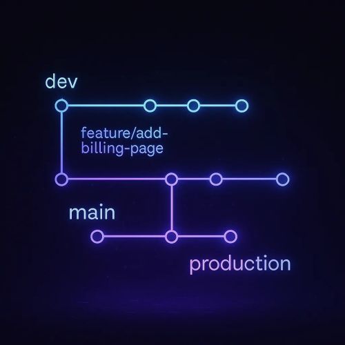 My Core Branches I only use three main branches across all my projects: production → deployed live to users main → stable, tested, ready to go dev → where I test, experiment, and integrate new features Everything else — features, fixes, and chores — branches off from dev.