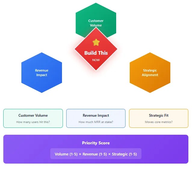 One team I know uses a simple scoring system: Customer volume (1–5) × Revenue impact (1–5) × Strategic fit (1–5). Anything scoring under 25 doesn’t make the Now list.