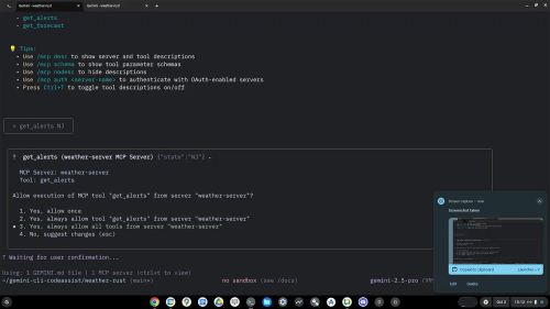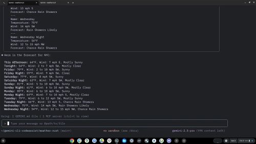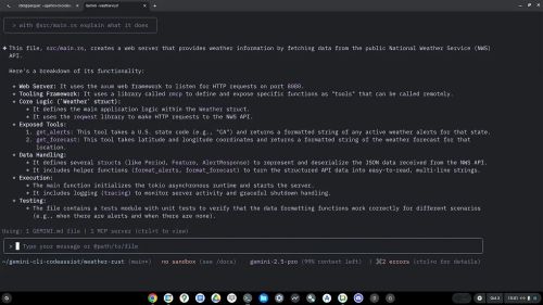 The weather MCP Rust server is reviewed with Gemini CLI:
