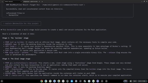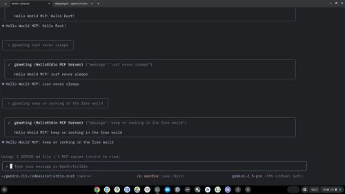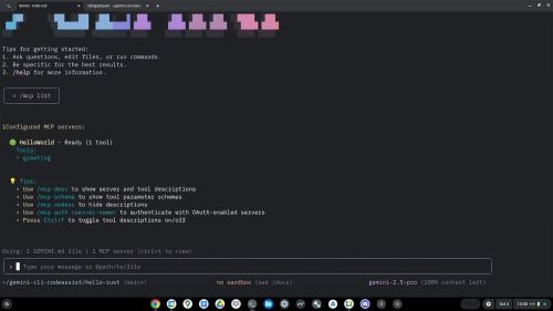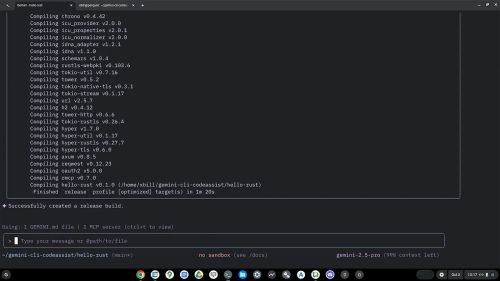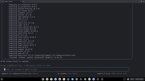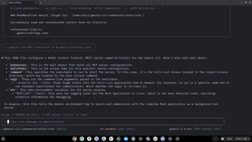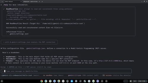 cd ~/gemini-cli-codeassist/stdio-rust gemini Then use Gemini CLI to review the project structure: