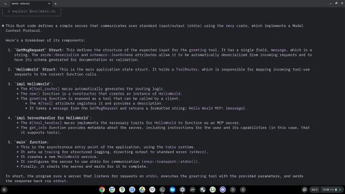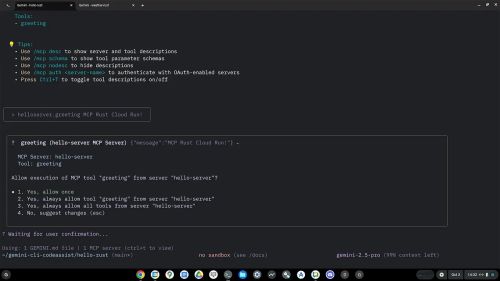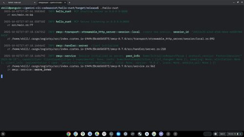 Finally, several more complex samples were built from Rust source code and deployed to Google Cloud Run in a container. These Cloud based Rust binary MCP servers were then validated with Gemini CLI acting as a MCP client over the HTTPS transport protocol.