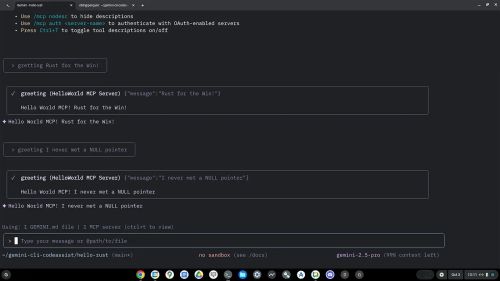 In this example — the connection from the local MCP client (Gemini CLI) to the local Rust MCP Server (hello-rust) is via the HTTPs transport. You can use Gemini CLI to validate the MCP connection settings: