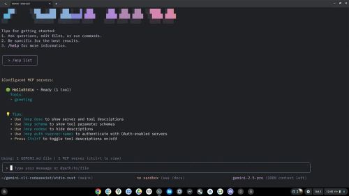 Finally- Gemini CLI is restarted and the MCP connection over stdio is validated: