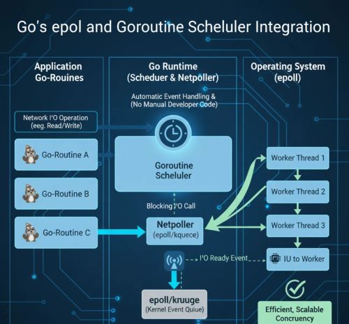Where epoll Dominates Go’s runtime integrates epoll seamlessly with its goroutine scheduler. The magic happens automatically: // Go's epoll is invisible conn, err := net.Listen("tcp", ":8080") go handleConnection(conn) // epoll magic happens here That simplicity masks sophisticated engineering. Go’s scheduler multiplexes thousands of goroutines across available threads, automatically parking blocked I/O operations. When a socket becomes readable, the scheduler wakes the corresponding goroutine — zero explicit management needed. Critical epoll Advantages: