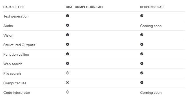 - Responses API — An improved version of the Chat Completions API, now integrated with built-in tool capabilities for smarter AI interactions.