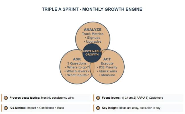 Act Execute small, high-impact changes consistently. Process beats tactics — following the Triple A sprint framework monthly creates sustainable growth.
