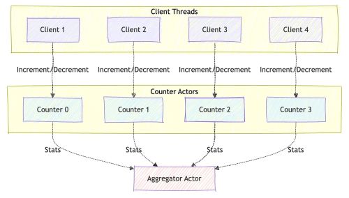 We’ll implement a counter system that demonstrates the core patterns you’ll use in real applications. Multiple client actors will send increment and decrement operations to counter actors, and we’ll aggregate statistics across all counters. This mirrors the kinds of aggregation problems you encounter when tracking metrics across a distributed system.