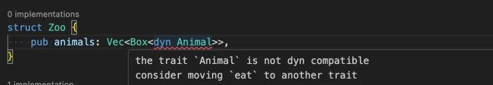 } First Problem When do those problems come in? Dynamic Dispatch! PS: If you want to read more about Dynamic Dispatch and Generics, please check out one of my previous articles Rust: Dyn (Dynamic Dispatch) vs Generics (Monomorphism / Static Dispatch)! For example, let’s add a Zoo that contains a field of a vector of Animals! struct Zoo {