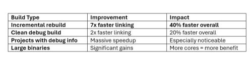 The performance gains come from parallelism — LLD uses all your CPU cores during linking, whereas older linkers typically use just one.