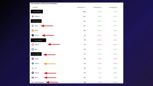 https://www.developerreport.com/developer-report?s=solana-became-the-1-ecosystem-for-new-developers-in-july-2024 Ethereum and its L2s had reigned for 8-years in new developer adoption counts. But in 2024, that changed. Solana, using Rust-contracts, surpassed Ethereum and its L2s by over 1,000 new developers. We see Ethereum (and its L2s) had a steep decline. Aptos, powered by Rust, was also able to bring in more new developers than Ethereum.