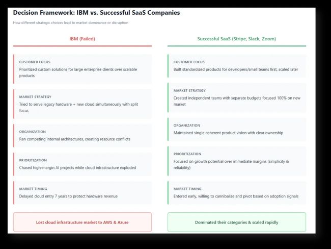Seven Strategic Errors and Their Modern Equivalents 1. Optimizing for Existing Customer Revenue Over Market Expansion IBM’s enterprise clients generated substantial revenue but required highly customized implementations. Engineering resources concentrated on one-off solutions rather than scalable products.