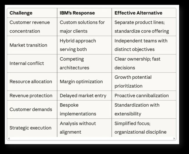 2. Managing Transition Rather Than Committing to It IBM pursued a hybrid strategy, attempting to serve legacy hardware customers while building cloud products. This preserved short-term revenue but diluted focus precisely when competitors were moving with singular purpose.