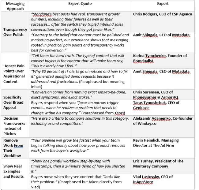 Messaging That Works Meeting those buyer needs requires a different messaging approach. The experts identified several approaches that work, not because they’re more creative or better optimized, but because they directly address buyer priorities before the call.