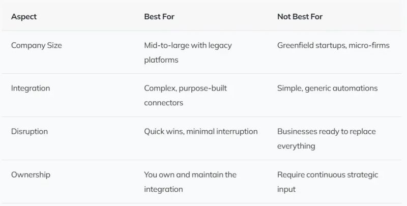 Summary Select this route if you want business-run optimization — let Pragmatic Coders deliver the initial automation, and empower your team to update workflows themselves, all with minimal IT burden. For heavy, complex, or regulated automations, a retrofit or custom approach fits better.