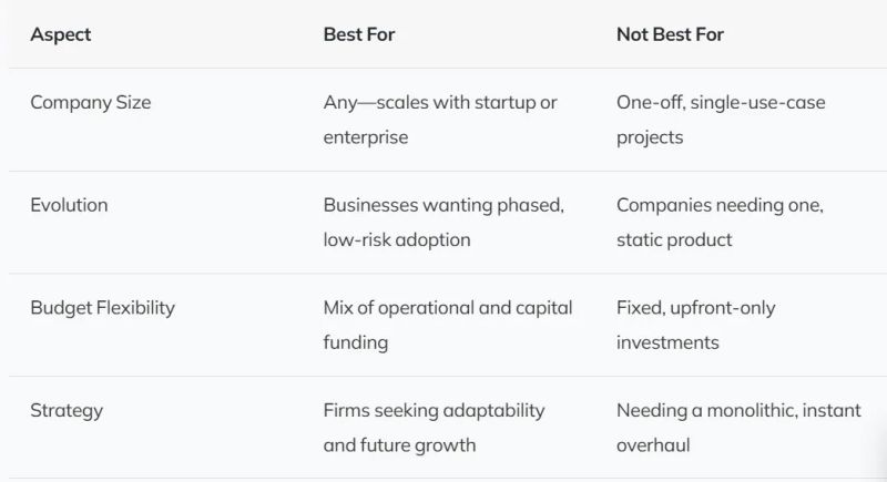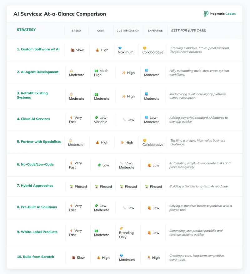 Summary Pick Hybrid Approaches if you want to start simple and quickly improve — layering new AI features as your business matures. Best for companies seeking low risk, continual upgrades, and a future-proof path. Skip this if you need a fixed, one-off tool or immediate full overhaul.