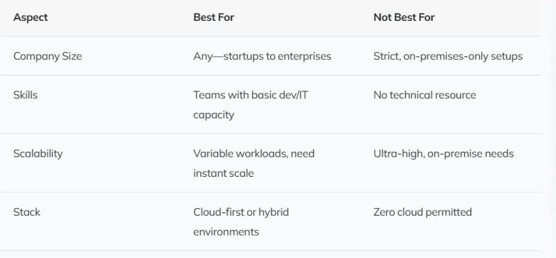 Choose API-First Cloud AI for rapid, reliable access to best-in-class AI. Ideal if you want seamless features and scaling without infrastructure headaches. If you can’t use the cloud or lack any in-house IT, look to SaaS or no-code options.