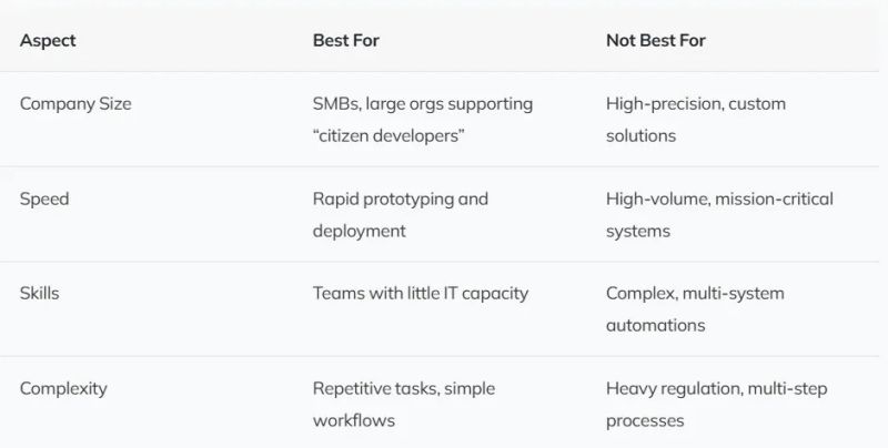 Versus No-Code/Low-Code: Hybrid can start simple (potentially with no-code), but evolves into custom and automated solutions.