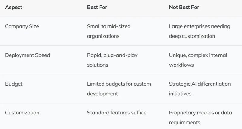 Pre-Built AI Solutions: Here you receive a tailored product, not a plug-and-play SaaS tool.