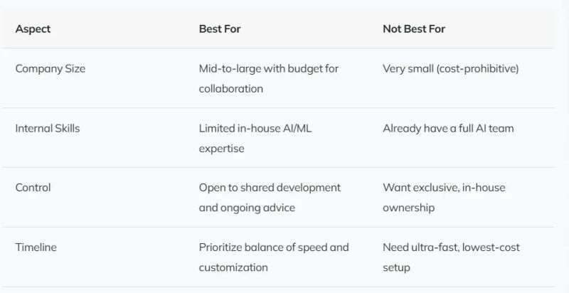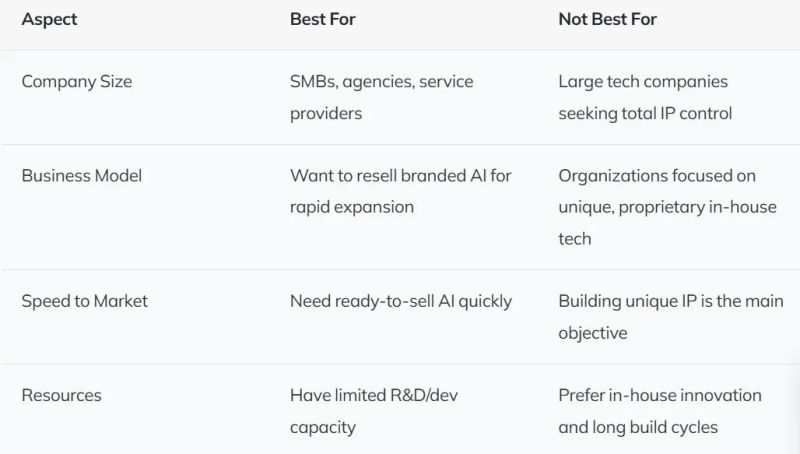 Opt for White-Label Custom AI Products if you aim to quickly expand your portfolio with an AI tool branded as your own — especially when building from scratch is impractical and time to market is key. It’s tailored for firms wanting to resell or offer AI-powered products with minimal technical investment. If your top priority is total IP ownership, internal innovation, or niche differentiation, custom builds or partnerships are a better fit.