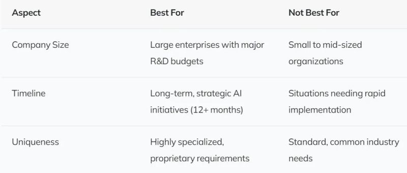 Choose this approach if your business demands maximum competitive differentiation, full control over AI models and intellectual property, and you have both the capital and expertise to support a major, multi-year R&D endeavor. If fast results, cost-effectiveness, or leveraging existing industry solutions are important, consider more pragmatic options like API integration, retrofit, or hybrid strategies.