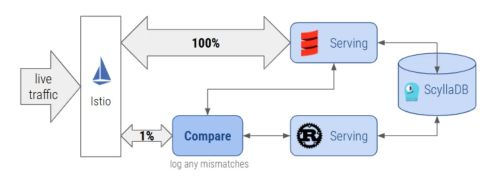 Ensuring Correctness Migrating a critical system like Feature Store Serving isn’t just about performance; it’s essential to guarantee that the new implementation behaves exactly as expected. While we relied on unit and integration tests to catch most issues, we were aware that there was still a risk of missing edge cases or subtle behavioral differences. To address this, we built a “Shadow Testing” system to capture any discrepancies.