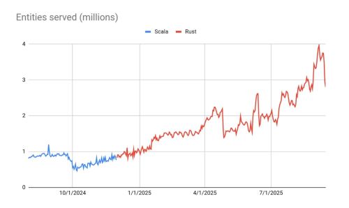 Even with this inefficiency, Rust still outperformed Scala by a wide margin. This gave us confidence to move forward with a full migration, knowing that the development process was manageable, the performance gains were real, and with more experience and tuning, we could push performance even further, even for a team new to Rust