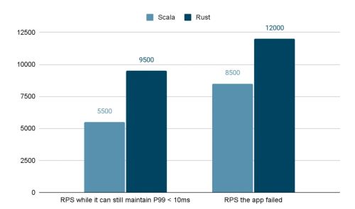 Once the POC was ready, we ran benchmarks to compare its performance with our Scala implementation. On identical VM specs, the benchmarks showed a dramatic improvement in favor of the Rust version, to no one’s surprise. As shown in the graphs below, Rust outperformed Scala across all key metrics: requests per second, CPU utilization, and memory usage, demonstrating a clear advantage in efficiency and scalability.